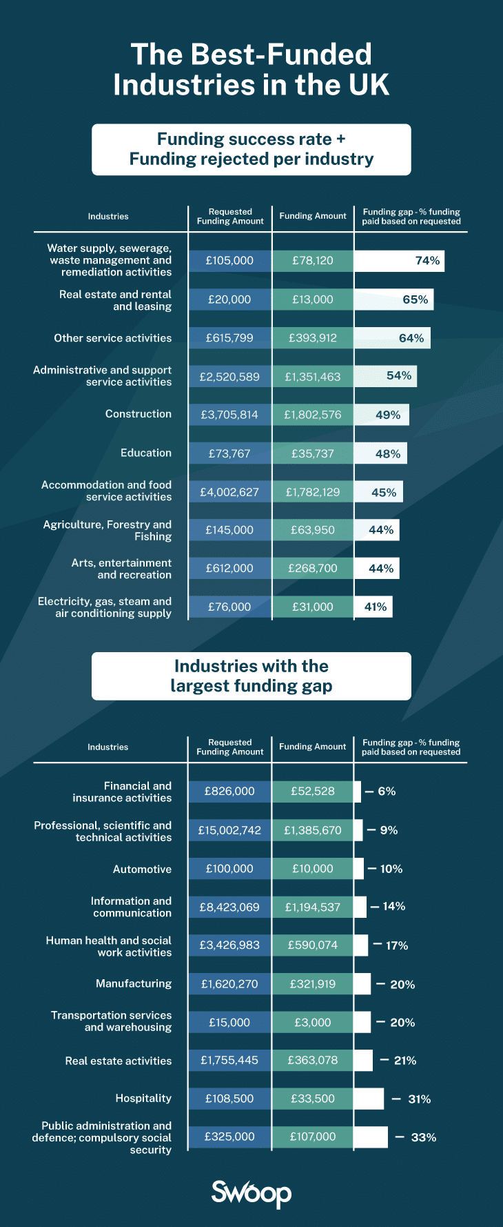 According to our data, Supply of water, waste, and waste management Business is the most likely to receive a large amount of funds requested. With an average demand in the field of £ 105,000, investors are usually given £ 78,120 for startup leaders, resulting in a success rate of 74%.
