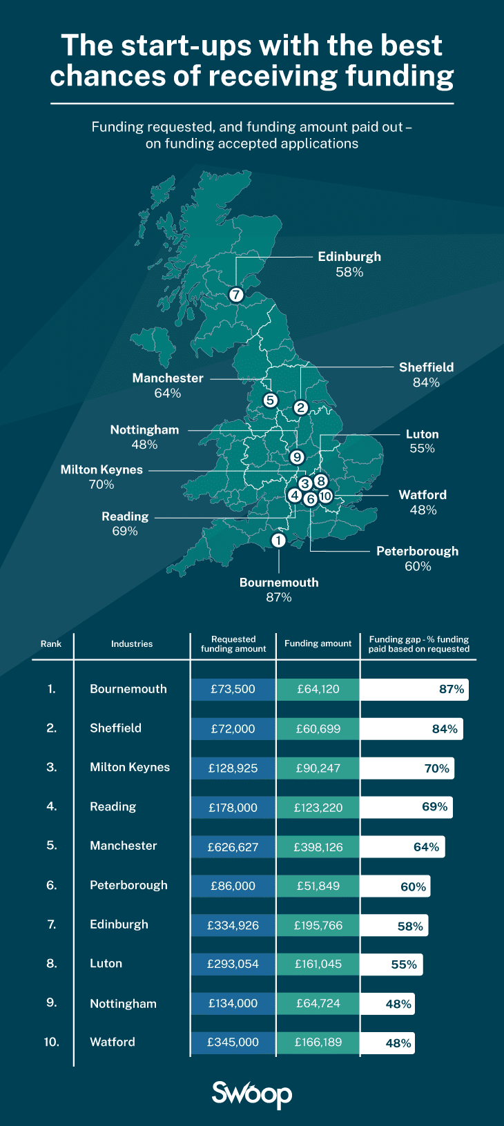 Sheffield followed behind with 84% of the funds received, while Milton Keynes Finis the third with 70%. Read (69%) and Manchester (64%) complete the top five.
