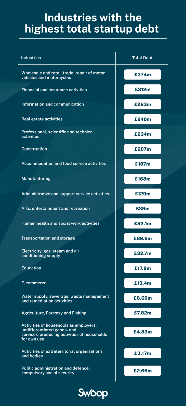 When it comes to the industry that borrows the most money, wholesale and retail trading Rank as the sector with the most debt in the UK. With 4,908 startups listed in this industry, more than £ 373 million in total. This industry is also the most common list of our platforms, shows that the market that is too saturated can play a role in its struggle to return with funding.